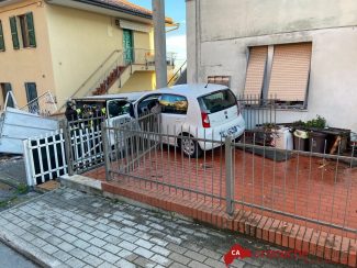 Stando ad una prima ricostruzione della dinamica, un’auto con alla guida un 71enne del posto è finita fuori strada andando prima ad abbattere la recinzione di un’abitazione che costeggia la via poi, dopo essere entrata nella proprietà, ha proseguito centrando il box auto dell’abitazione adiacente rimanendo poi in bilico su alcune scale.
