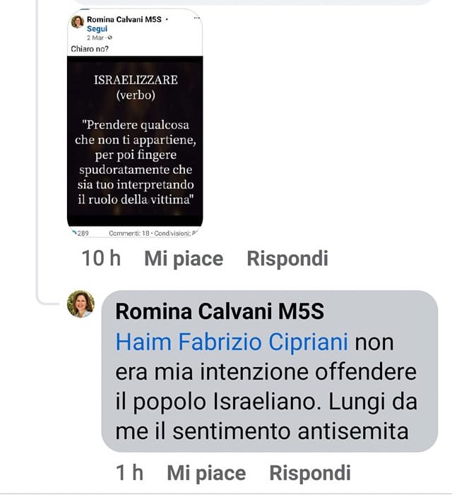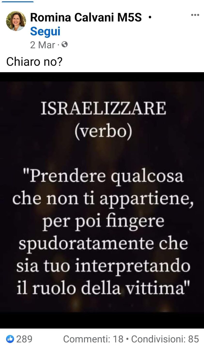 Il 2 marzo scorso ha condiviso un post che circolava sui social da giorni, sollevando la reazione indignata del rabbino Haim Fabrizio Cipriani, rappresentante dell’Unione delle comunità ebraiche italiane (Ucei), che ha subito scritto una lettera al sindaco Roberto Ascani e alla presidenza del Movimento Cinque Stelle. La vice sindaco di Castelfidardo, Romina Calvani, oltre alla condivisione di quel messaggio su Fb che recitava “Israelizzare (verbo). Prendere qualcosa che non ti appartiene, per poi fingere spudoratamente che sia tuo interpretando il ruolo della vittima”, aveva aggiunto il suo commento: «Chiaro no?»