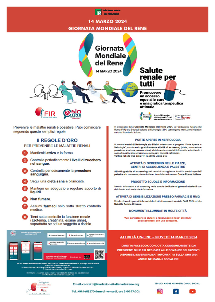 In occasione della giornata mondiale del rene prevista per il 14 marzo, la Sos Nefrologia, Dialisi e Trapianto Rene dell’Azienda Ospedaliero Universitaria delle Marche, diretta dal professor Andrea Ranghino, organizza nell’atrio principale dell’ospedale di Torrette di Ancona una giornata di screening dedicata alle malattie renali. Dalle ore 10 alle ore 16 del 14 marzo, i medici e gli Infermieri della Sod Nefrologia, Dialisi e Trapianto Rene rileveranno a titolo gratuito la pressione arteriosa e se necessario sarà eseguito un esame urine. Sarà distribuito materiale informativo sulla salute dei reni e consigliata eventuale visita nefrologica.