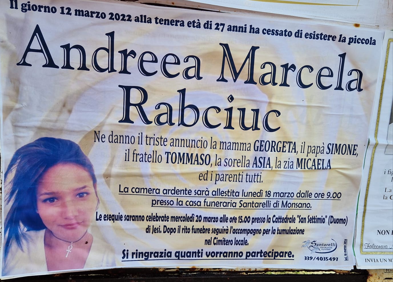 Rose bianche e blu e offerte da devolvere a Telefono Rosa per l’ultimo saluto ad Andreea Rabciuc, la 27enne scomparsa il 12 marzo del 2022 da un casolare di Montecarotto dopo una serata trascorsa con il fidanzato e due amici. I resti della ragazza, cercata per quasi due anni, sono stati ritrovati lo scorso gennaio in una casa colonica di Castelplanio ad appena un chilometro del luogo dell’ultimo avvistamento. Un mese fa la Procura aveva dato il nulla osta per la restituzione della salma alla famiglia che ora annuncia le esequie fissate per mercoledì prossimo 20 marzo, alle ore 15 nella cattedrale di San Settimio a Jesi. La camera ardente, allestita nella casa funeraria Santarelli di Monsano, sarà aperta alla visite lunedì 18 e martedì 19 marzo dalle ore 9 alle 20. Accanto alla bara, come ultimo, delicato atto d’amore, ci saranno i fiori con i colori, il bianco e il blu, più amati da Andreea, che dopo il funerale, riposerà per sempre al cimitero di Jesi. Non è casuale neppure la scelta dei familiari di destinare le donazioni all’associazione che sostiene lle donne vittime di violenza e di maltrattamenti.