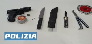 Arrivati gli agenti, lo jesino è stato identificato e perquisito per poi venir trovato in possesso della pistola a piombini, di una scatola contenente centinaia di piombini e di 3 coltelli con lame rispettivamente di 10, 12 e 18 centimetri nascosti nel giubbotto. Il tutto è stato sequestrato. L’uomo, accompagnato al Commissariato, è stato denunciato.