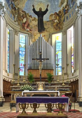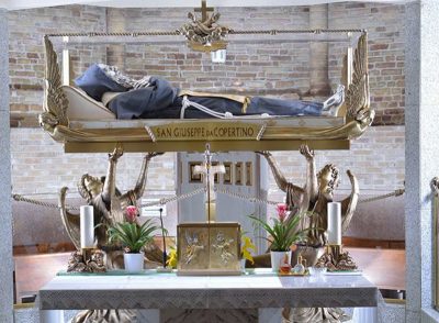 La basilica-santuario San Giuseppe da Copertino e l’annesso convento dei frati Minori Conventuali sono situati nel centro storico di Osimo. Il complesso monumentale si trova in via san Francesco in corrispondenza del tratto meglio conservato delle mura romane (174 a.C.). Il Serafico di Assisi arriva a Osimo nel 1215 e nel 1234 e gli viene dedicata la consacrazione della chiesa di san Francesco di cui ancora oggi osserviamo parti dell’antico edificio nell’architettura esterna. A seguito della beatificazione di san Giuseppe da Copertino (1773) la chiesa diventa oggetto di numerose trasformazioni ideate da Alessandro Rossi. La salma del Santo pugliese viene sistemata sotto l’altare già nel 1771; oggi è conservata nella cripta costruita nel 1963. La chiesa, consacrata nel 1781 dal vescovo card. Calcagnini, da allora cambia nome: da chiesa di san Francesco (appellativo ancora oggi utilizzato) a chiesa dedicata a san Giuseppe da Copertino.