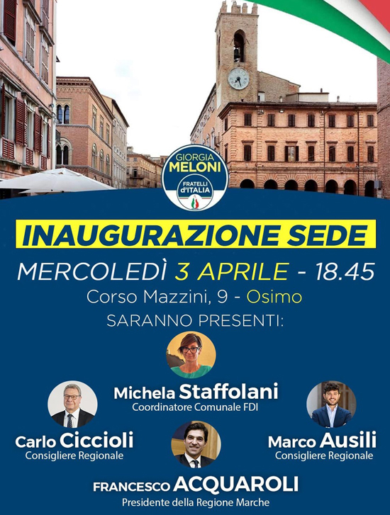 La sede elettorale di Fratelli d’Italia sarà inaugurata mercoledì 3 aprile alle ore 18.45 negli spazi di corso Mazzini n. 9 a Osimo. Interverranno il presidente della Regione Marche, Francesco Acquaroli, la senatrice Elena Leonardi, vicepresidente Commissione parlamentare di inchiesta sul femminicidio e violenza di genere nonché membro della Commissione parlamentare per l’infanzia e l’adolescenza, Carlo Ciccioli, consigliere regionale e candidato al Parlamento Europeo e Marco Ausili, consigliere regionale. In questi giorni Francesco Pirani, candidato sindaco di Liste civiche-FdI, è in convalescenza dopo essersi sottoposto ad un piccolo intervento chirurgico che l’ha costretto alla degenza in ospedale e a saltare l’appuntamento con i primi incontri programmati nell’agenda elettorale dall sua coalizione.