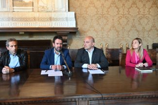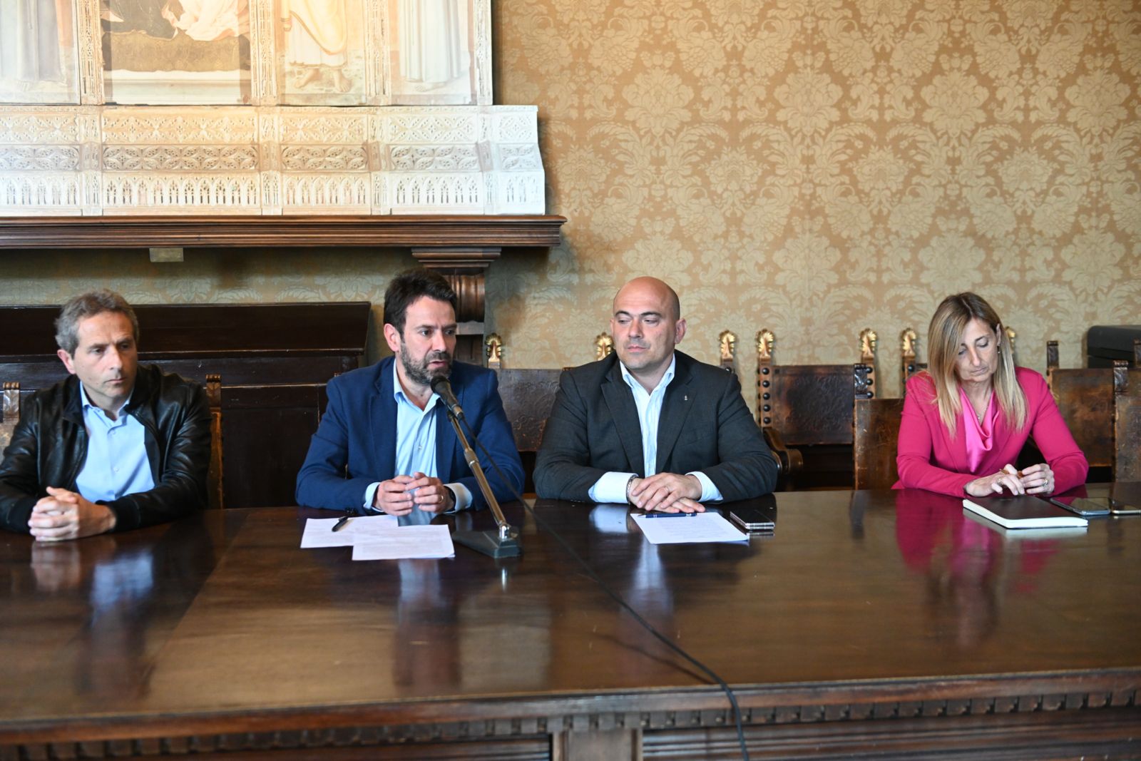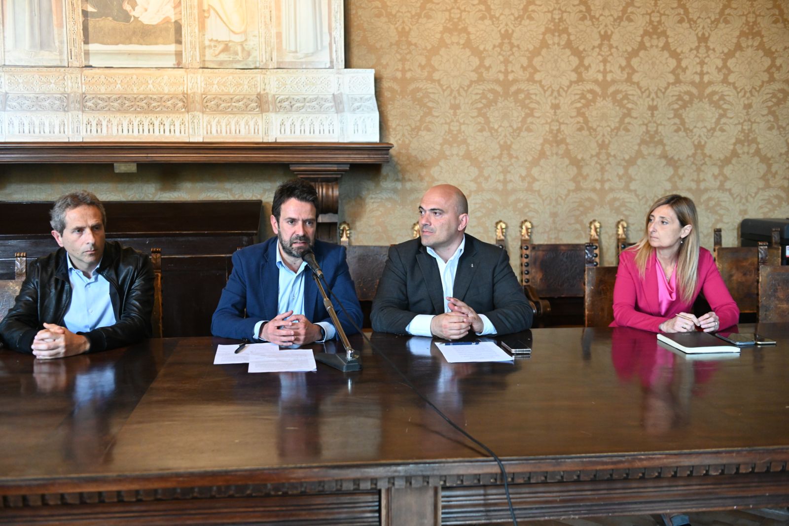 Un momento della conferenza stampa di questa mattina a Palazzo comunale, da sin. l’arch. Bugatti, il presidente Carnevali, il sindaco Pugnaloni e l’arch. Vecchietti