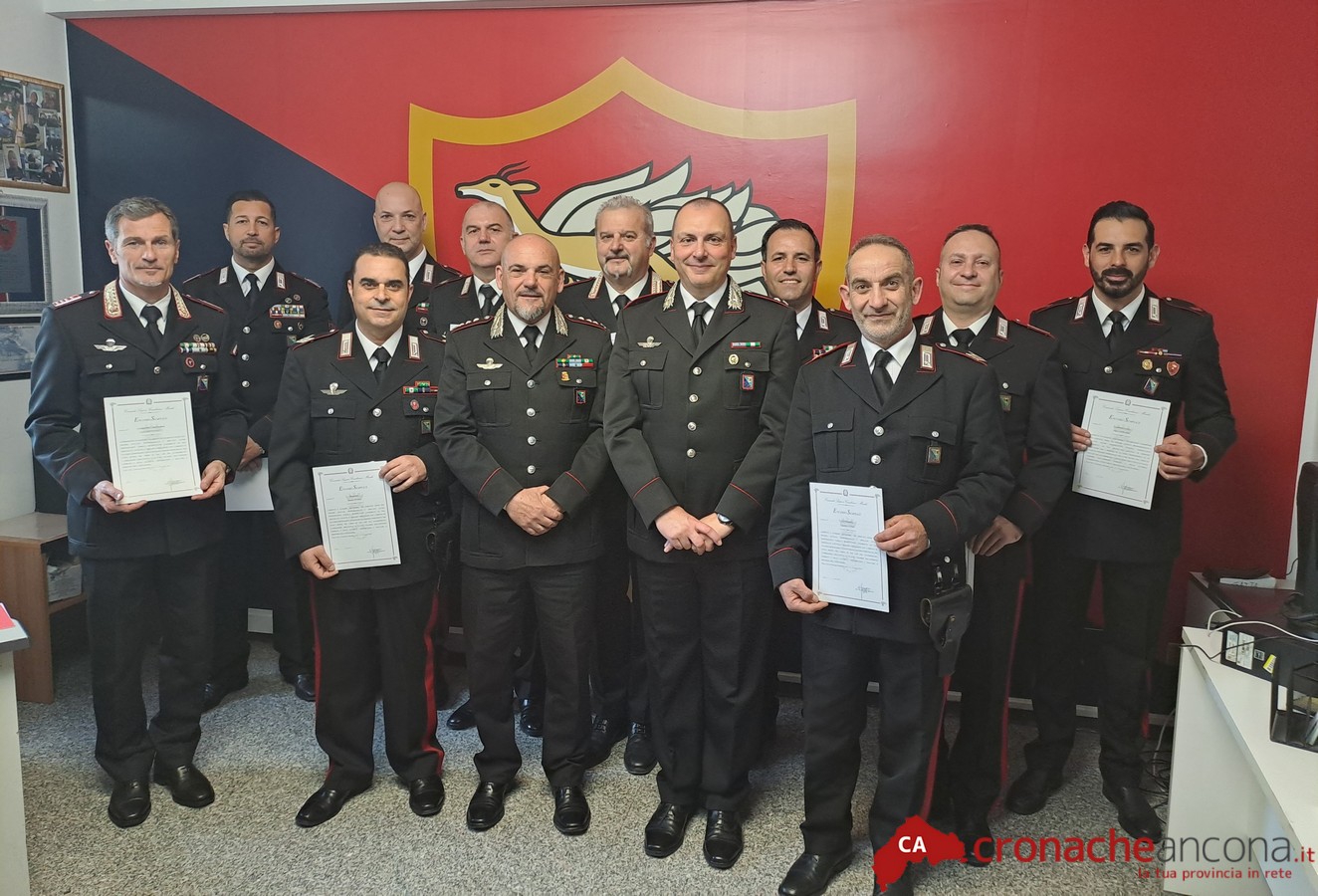 A ricevere la ricompensa sono stati, oltre al Ten. Col. Luigi Ciccarelli, all’epoca dei fatti Comandante della Compagnia Carabinieri di Osimo, che ha ricevuto l’Encomio direttamente dal Gen. B. Cagnazzo, i Luogotenenti Giuseppe Esposto e Massimiliano Giulioni, rispettivamente Comandante del Norm e addetto all’Aliquota Operativa, il Brigadiere Capo Q.S. Giuseppe Massimiliano Coscia e il Carabiniere Scelto Nino Lombardi, rispettivamente Capo Equipaggio e autista dell’Aliquota Radiomobile del Norm, l’Appuntato Scelto Q.S. Luca Vissani, operatore di Centrale Operativa, il Luogotenente C.S. Luca Cristofanetti, Comandante della Stazione di Numana, il Maresciallo Ordinario Mauro Campanale, il Brigadiere Rosario Russo, il Vice Brigadiere Giuseppe Abbaticchio, gli Appuntati Scelti Angelo Antonio Fiore e Silvestro Tebano, tutti appartenenti alla Stazione di Numana, il Maresciallo Capo Paolo Ciarrocca e il Brigadiere Giuseppe Guida, rispettivamente Comandante e addetto alla Stazione di Camerano.