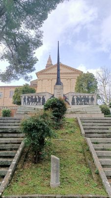 Il Monumento ai caduti di tutte le guerre realizzato lungo il pendio che porta da via XX Settembre alla sommità del colle della chiesa di San Francesco e (in primo piano) il cippo colonna sul luogo dove morì il partigiano della Brigata Maiella Tarcisio Tassi di Poggio San Marcello