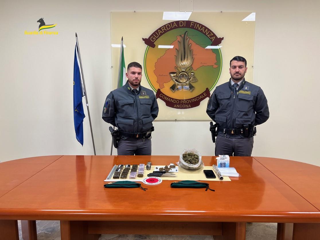 ANCONA - I Baschi Verdi della Guardia di Finanza lo hanno fermato a Tavernelle, mentre era di rientro a casa. Indagini in corso per ricostruire le fonti di approvvigionamento e la relativa filiera dello spaccio