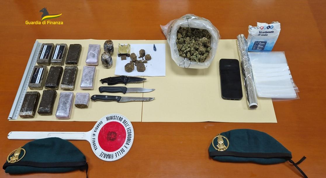 Entrati in casa, hanno trovato e sequestrato un totale di 14 panetti di hashish del peso complessivo di 1,398 chili; una busta di cellophane contenente 297 grammi di marijuana nonché svariato materiale per il confezionamento e per il taglio della sostanza stupefacente. Quantitativi che, una volta immessi sul mercato, avrebbero fruttato oltre 17mila euro.