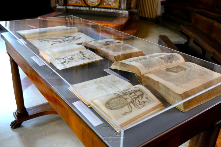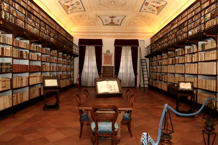 Dopo l’intervento introduttivo di Fiammetta Sabba (UniBo) che ha discusso sulle strategie di valorizzazione dei fondi librari antichi, l’intervento centrale è stato affidato a Monica Bocchetta (Unime) che ha condotto un interessante excursus sulla complessa formazione della collezione della Biblioteca storica, strettamente connessa alle vicende storiche del Collegio e del Seminario Campana e ai personaggi che ne guidarono le sorti. Molto partecipata anche la visita guidata, condotta da Costanza Luccchetti (UniMc), al salone della Biblioteca storica, che si caratterizza per le decorazioni a grottesche e le scansie lignee originali, e alla mostra bibliografica allestita per l’occasione nella Cappella, dove sono stati esposti alcuni degli esemplari più pregevoli della collezione.