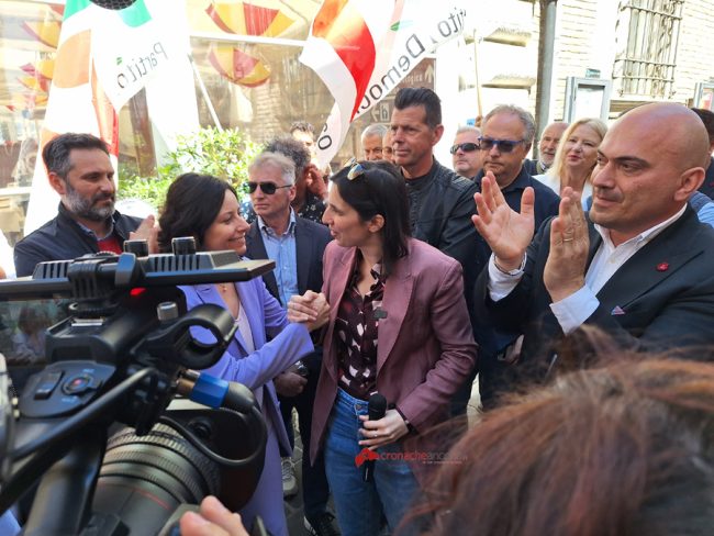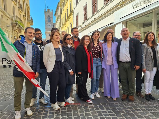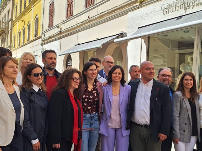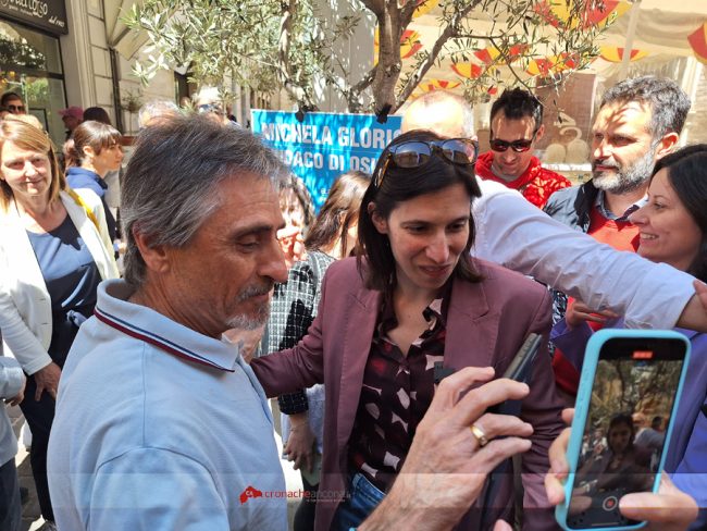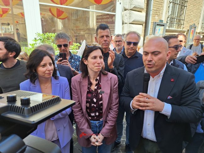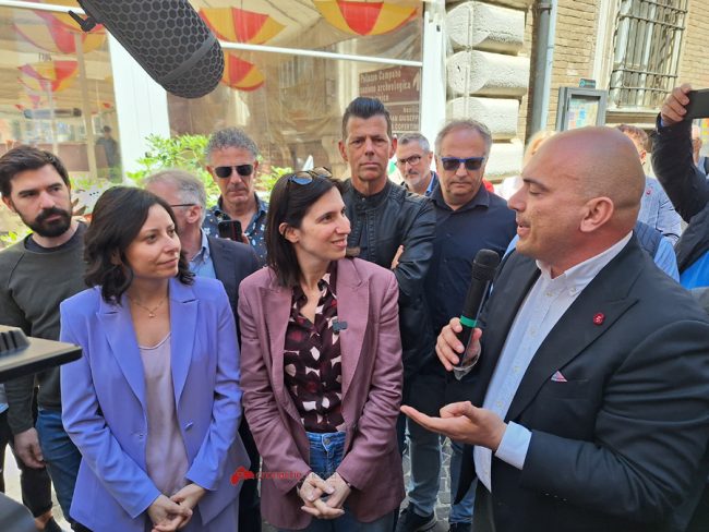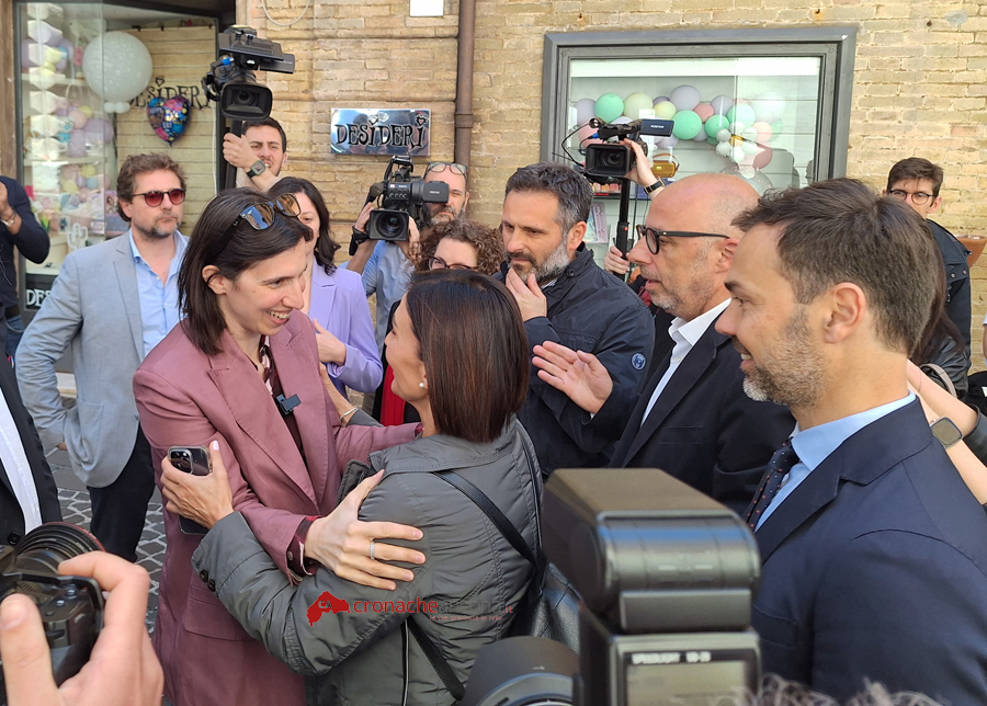 Schlein ha subito abbracciato Michela Glorio, pronta a raccogliere il testimone dal sindaco Simone Pugnaloni, dopo 10 anni di mandato amministrativo, con il sostegno di una coalizione di 8 liste improntate allo schema del campo largo che include oltre al Pd anche il M5S. «La ringrazio per essersi messa a disposizione di coalizione dove c’è un Partito Democratico forte- ha detto al leader del Pd – Voglio ringraziare tutte le candidate ai candidati della lista del Partito democratico perché so che ci stanno mettendo il cuore per continuare a governare bene questa città, per continuare a mettere al centro i bisogni concreti dei cittadini noi siamo qua solo per questo. Ci sono alcuni bisogni fondamentali su cui fa tanto differenza votare per Michela o votare per i suoi avversari. Lo fa l’attenzione alle persone che hanno più bisogno, al trasporto pubblico locale su cui questo governo non ha messo un euro e questo vuol dire meno servizi per i cittadini. Noi vogliamo rendere più vivibili le nostre città, capire come riuscire a far abbassare le bollette alle imprese, e alle famiglie, anche attraverso l’istituzione delle comunità energetiche sono una straordinaria opportunità per cittadini, Comuni, scuole, case popolari ma anche per le aziende che possono mettersi insieme per produrre energia pulita e per abbassare la bolletta, abbassare anche le emissioni l’inquinamento che fa male al pineta. Tenere insieme la questione sociale, la giustizia sociale è l’ispirazione di chi come noi sta a sinistra. Lasciamo alla destra di continuare a negare l’emergenza climatica. Se teniamo insieme al centro questi grandi bisogni collettivi non sbagliamo».