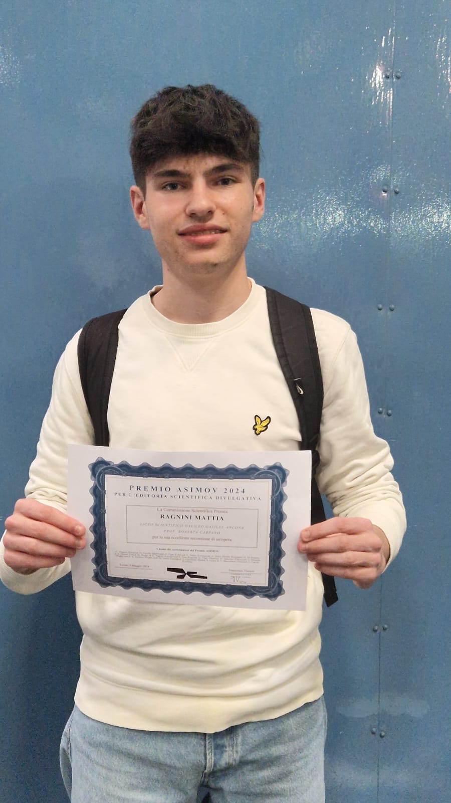 Il Liceo Scientifico Galileo Galilei di Ancona sul podio al Salone del Libro di Torino: lo studente Mattia Ragnini (classe 4M), accompagnato dalla professoressa Roberta Carpano (di italiano e latino), ha partecipato ieri, 9 maggio, alla proclamazione del libro vincitore del Premio Asimov, in qualità di primo classificato del concorso per la Regione Marche, con la recensione del libro ˊLa scorciatoiaˊ, di Nello Cristianini. Nel corso della cerimonia, Mattia è stato premiato insieme ai campioni provenienti dalle altre regioni italiane e all’autore di ˊAltre Terreˊ, Giovanni Covone.