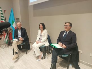 Da sin. Francesco Pirani, Michela Glorio e Sandro Antonelli, insieme al confronto tra candidati sindaci organizzato da Cgil, Cisl e Uil