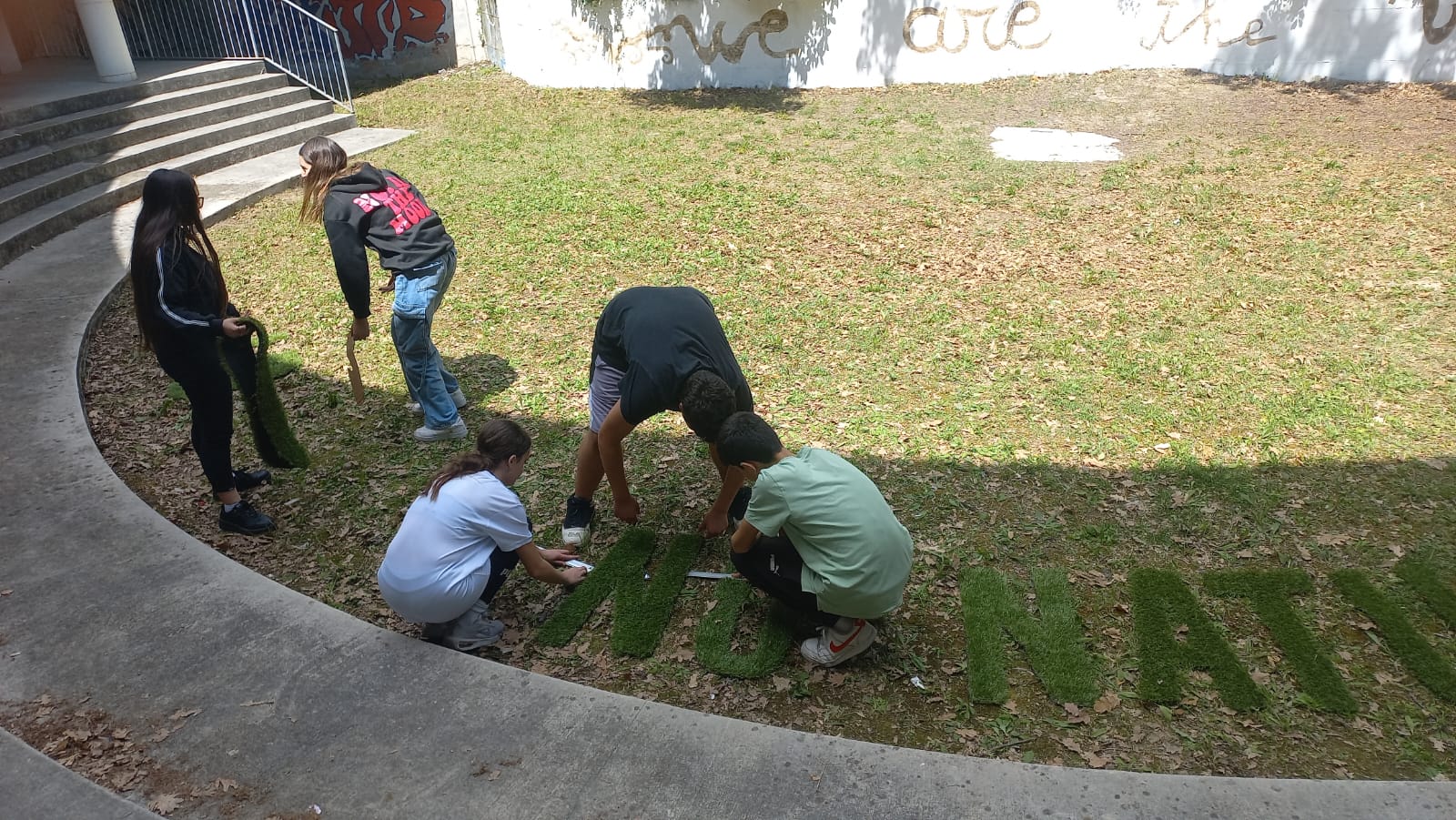 Alla realizzazione della sua messa a terra dell’opera d’arte nel cortile scolastico della Michelangelo, hanno partecipato gli alunni delle classi terze, sezione A e B suddivisi in cinque gruppi che in forma di gioco, attraverso le lettere accostate casualmente nel prato, hanno ricomposto la frase originale della installazione. Gli studenti risolta la consegna, sono divenuti così i protagonisti di una intelligente competizione creativa che li ha portati –secondo il maestro Bruno Mangiaterra- a essere «i custodi presenti e futuri dellopera e dei valori che essa comunica: la salvaguardia dell’ambiente naturale che rappresenta ormai un imperativo categorico per le giovani generazioni». Il progetto interdisciplinare ha visto inoltre la compartecipazione delle insegnanti di Educazione Civica Anna Malusà, di Arte Loredana Fammilume e dello stesso artista autore e insegnante di Tecnologie