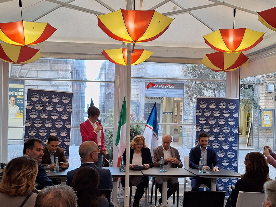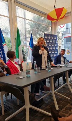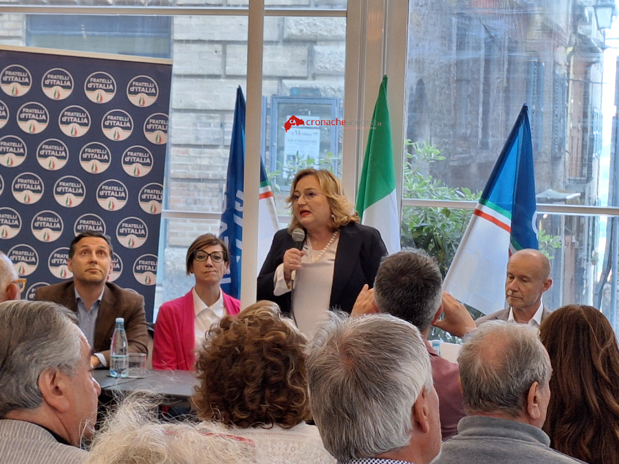 «Per l’Italia, le Marche esprimono una grande forza. La nostra regione viene considerata a livello nazionale un punto di riferimento per Fratelli d’Italia: abbiamo il governatore, 4 parlamentari e un sottosegretario all’Economia, il commissario alla ricostruzione, abbiamo una classe dirigente forte e capace che sta contribuendo a cambiare l’Italia. Un anno e mezzo fa nessuno conosceva e aveva  presente i problemi della nostra regione, dall’alluvione, alla continuità territoriale dell’aeroporto, fino all’isolamento infrastrutturale. Poi, però, sono arrivati 400 milioni per l’alluvione grazie al presidente del Consiglio, i 9 milioni della continuità territoriale, 532 milioni per l’accordo di coesione, e soprattutto ci sono le risorse infrastrutturali» Lo ha ricordato oggi pomeriggio la deputata Lucia Albano (FdI), sottosegretaria al Mef con delega alla ricostruzione post-sisma, intervenendo a ‘Caffè del Corso’ di Osimo all’aperitivo tricolore organizzato dal partito di Giorgia Meloni. Fratelli d’Italia sostiene, insieme alle Liste Civiche Osimo, il candidato sindaco Francesco Pirani per le Comunali dell’8 e 9 giugno. All’incontro hanno partecipato oltre a lui, la coordinatrice osimana di FdI  Michela Staffolani, il consigliere regionale Marco Ausili e il deputato Stefano Benvenuti Gostoli. Assente invece per altri impegni Carlo Ciccioli, coordinatore provinciale di FdI, consigliere regionale nonché candidato per FdI alle Europee nell’election day.