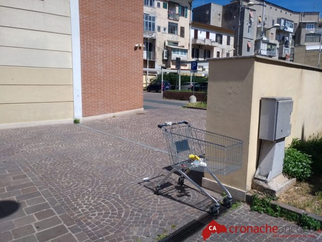 Il carrello della spesa di un supermercato a Vallemiano, finito nella piazzetta ex Cinci
