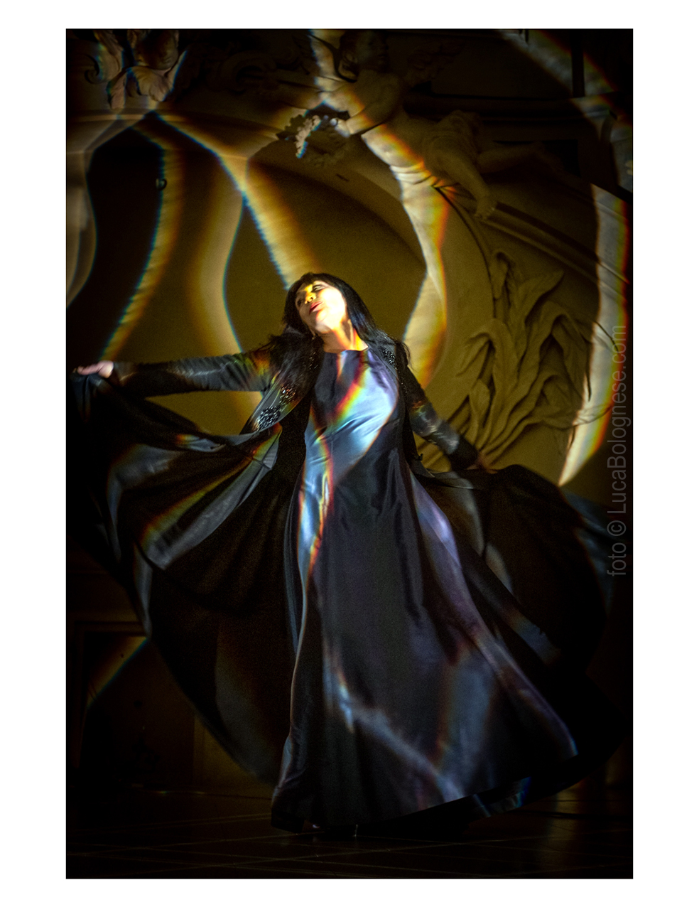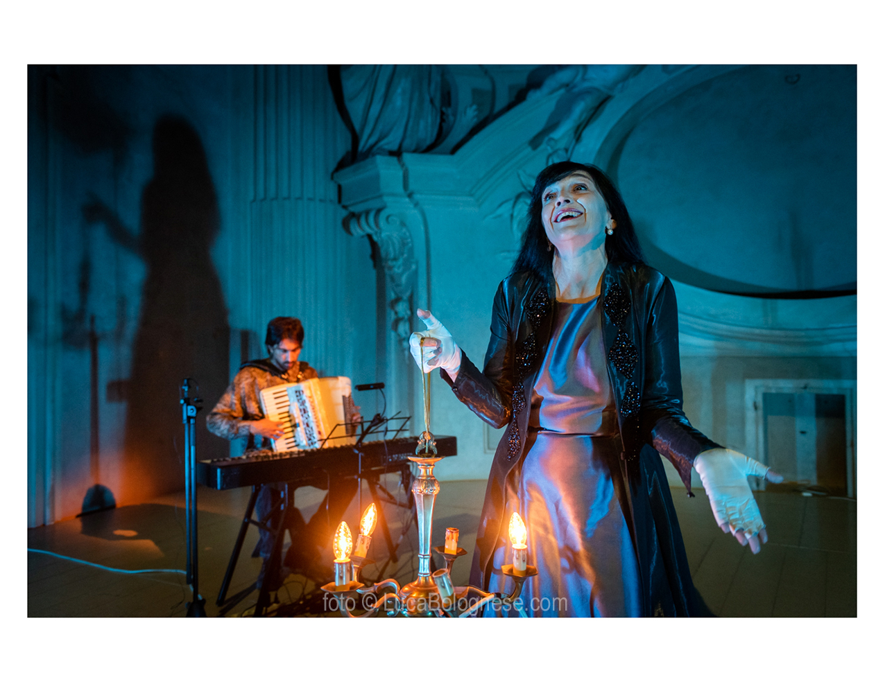 In una veste blu notte, tra architetture musicali eseguite dal vivo, l’artista intona un’ode alla vita, sospesa tra storia e invenzione, in cui i fili della memoria restituiscono una folla di quadri viventi della sua terra. “Sembro sola, ma sono circondata da una miriade di fantasmi che chiedono di essere raccontati. Se non lo faccio io chi mai lo farà? – spiega la Bucci nelle note di regia – Siamo in un palazzo abbandonato, in una vecchia casa di campagna, in una palude di Romagna tra acqua e cielo, in una grande città, dentro un sogno o un’anima, sopra un albero incantato o nel giardino dei poeti. Possiamo incontrare una novantenne dall’anima di bambina, un cineamatore a cui sfugge la realtà, una formidabile donna cantastorie, un contadino che non vuole abbandonare la sua casa anche quando il fiume inonda la campagna riprendendo il corso originario. Tramandata di voce in voce una ninna nanna scongiura guerre e avidità contro le quali lotto aprendo le braccia per raccontare tutte le storie di tutti e non perderne le memorie. È un’impossibile impresa, un fallimento dichiarato che mette allegria. Non c’è nulla da perdere e una marea di cose da imparare”