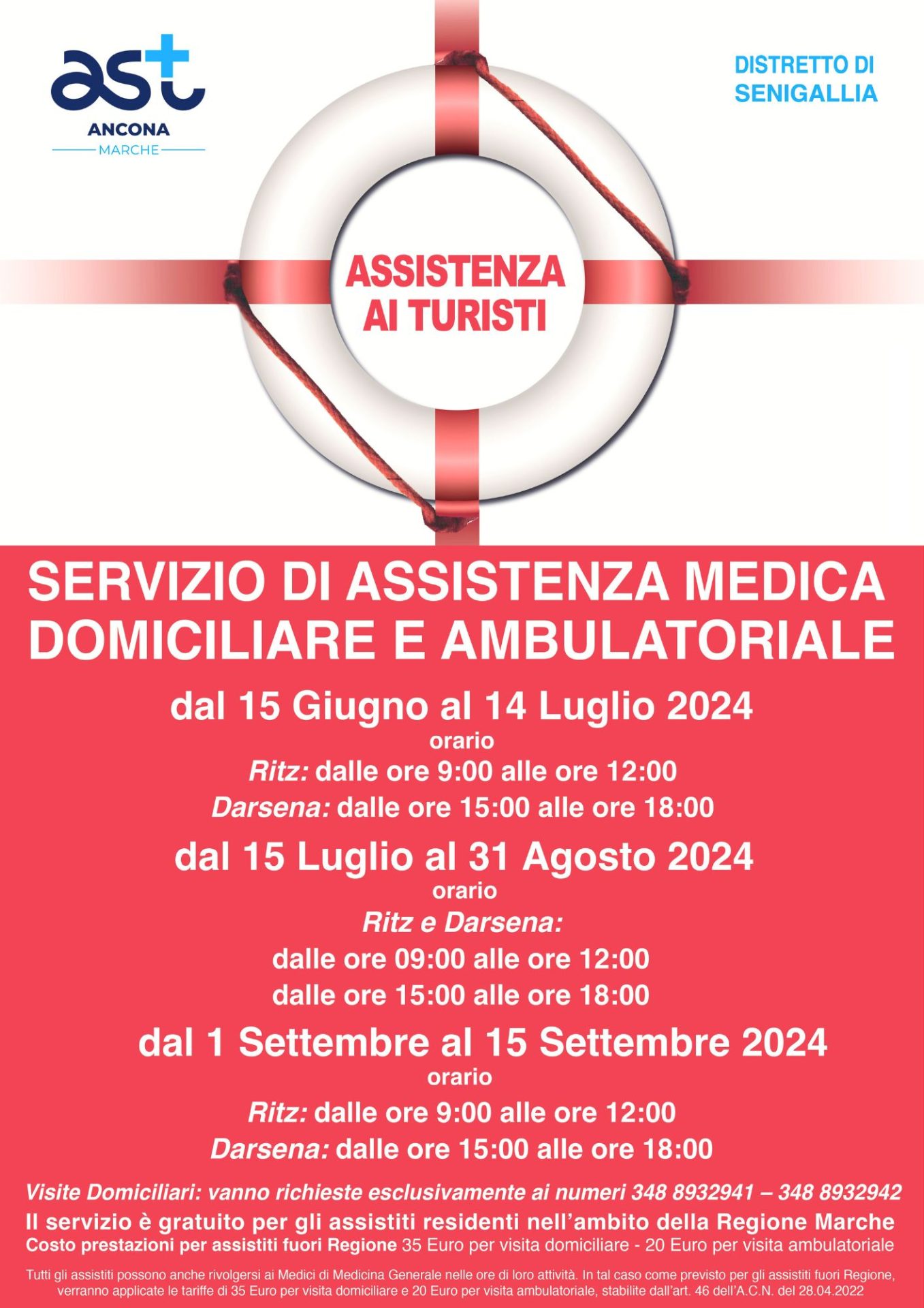Dal 15 giugno al 14 luglio 2024 orario RITZ dalle ore 9.00 alle ore 12.00 e DARSENA dalle ore 15.00 alle ore 18.00; dal 15 luglio al 31 agosto 2024 orario sia RITZ sia DARSENA dalle ore 9.00 alle ore 12.00 il mattino e dalle ore 15.00 alle ore 18.00 il pomeriggio; dal 1 settembre al 15 settembre 2024 orario RITZ dalle ore 9:00 alle ore 12:00 e DARSENA dalle ore 15:00 alle ore 18:00. Le visite domiciliari andranno richieste esclusivamente ai numeri 348 8932941 – 348 8932942.