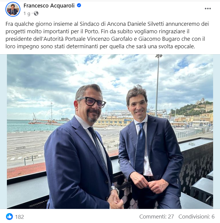 «Fra qualche giorno insieme al sindaco di Ancona Daniele Silvetti annunceremo dei progetti molto importanti per il Porto. Fin da subito vogliamo ringraziare il presidente dell’Autorità Portuale Vincenzo Garofalo e Giacomo Bugaro che con il loro impegno sono stati determinanti per quella che sarà una svolta epocale». Con un messaggio pubblicato in tadem nei rispettivi profili Fb il governatore delle Marche, Francesco Acquaroli, ed il sindaco di Ancona, Daniele Silvetti, hanno annunciato grandi progetti per lo scalo portuale dorico.
