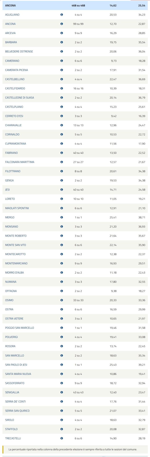 Tra i Comuni più importanti della provincia chiamati alle urne nella doppia competizione elettorale ci sono Osimo con 33,36%; Filottrano con 34,38%; Numana 32,55%, Sirolo 32,79% e Montemarciano con 29,51%.
