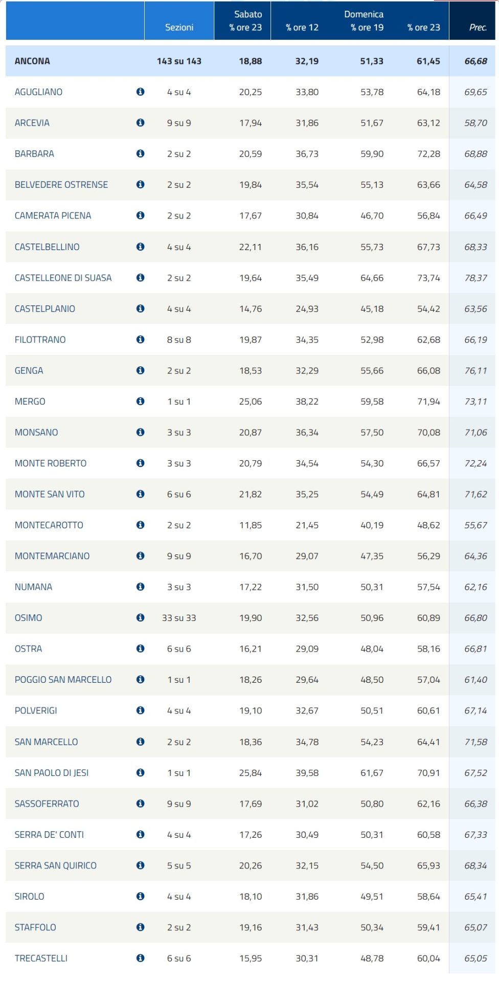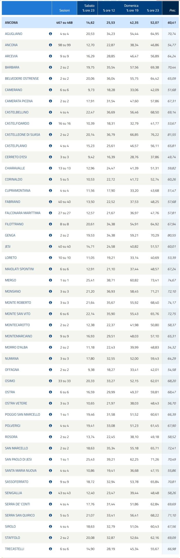 Nella provincia di Ancona, per quanto riguarda le Europee, è del 60,41% contro il 41,58% registrato alle 19. Per le Comunali è del 66,68% rispetto al 51,83%.