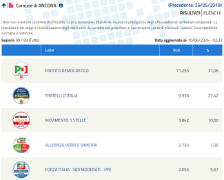 Fatte le dovute premesse quindi, I Dem hanno vinto la tornata elettorale nella cittadina dorica grazie a 11.255 voti pari al 31,06% dei consensi. Segue Fratelli D’Italia con 9.936 preferenze e una percentuale del 27,42%. Fdi però potrebbe mandare l’anconetano Carlo Ciccioli a Bruxelles. I complessi calcoli in corso nelle prossime ore emetteranno il verdetto definitivo in merito.