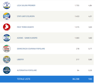 Molto meglio della media nazionale ottiene invece Stati Uniti D’Europa con il 4,01% (e 1.543 schede a favore). Stessa cosa per il partito del giornalista Michele Santoro Pace Terrà Dignità con un buon 3,63% e 1.315 voti ottenuti.