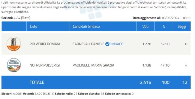 Ha votato il 60,61% degli aventi diritto per un totale di 2.416 voti validi.