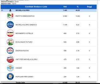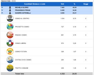 Il partito più votato alle Comunali di Osimo è stato il Pd (14,66%), seguito dalle lista ‘Osimo al Centro’ con l’8,79% e da ‘Lista Glorio sindaco’ (8,24%) . Buona performance della lista ‘Pirani sindaco’ con 7,67%, Fratelli d’Italia si è fermato 7,39% e Unione di Centro-Lista Latini a 6,29% mentre la storica Su La Testa a 6,05%. Progetto Osimo si è invece attestata al 4,16%, Sono queste le liste,delle 24 in competizione al primo turno che potrebbero essere rappresentate della composizione della nuova Sala Gialla. Certo bisognerà attendere l’esito del ballottaggio per capire quali consiglieri comunali siederanno sui banchi di maggioranza o di minoranza del Consiglio comunale a seconda di chi vincerà il secondo turno di voto, Michela Glorio (centrosinistra-M5S-Civiche) o Francesco Pirani (Liste civiche-FdI). Meno brillanti i risultati di Rinasci Osimo che ha raggiunto il 3,79%, del M5S che si è fermato al 3,72% e di Osimo Libera al 3,29%.