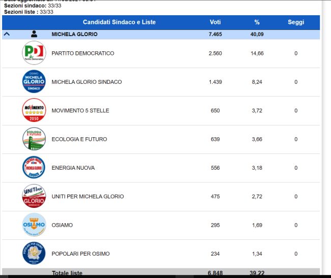 Se la candidata sindaco Michela Glorio optasse per l’apparentamento da stringere con tutte le liste della coalizione civica, i seggi consiliari per Antonelli passerebbe da 4 a 5 (il quinto seggio sarebbe assegnato a ‘Rinasci Osimo’) e sarebbero ceduti 2 dai consiglieri dal Pd, 2 da quelli dalla lista Glorio e uno dagli eletti dalla lista ‘Uniti per Glorio’.