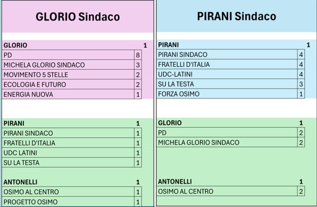 Se il secondo turno di voto sarà vinto invece da Francesco Pirani i nove consiglieri di maggioranza andrebbero: 4 alla lista ‘Pirani Sindaco, 3 a Fratelli d’Italia, 3 a Su la Testa, 3 alla lista Latini, uno a Forza Osimo e uno per Lista Green, In minoranza 5 seggi sarebbe accreditati alla coalizione Glorio (uno alla candidata sindaca di diritto, 3 al Pd e 2 alla Lista Glorio). Antonelli invece manterrebbe i 4 seggi conquistati (uno al candidato sindaco di diritto, 2 a ‘Osimo al Centro’ e uno per ‘Progetto Osimo’)