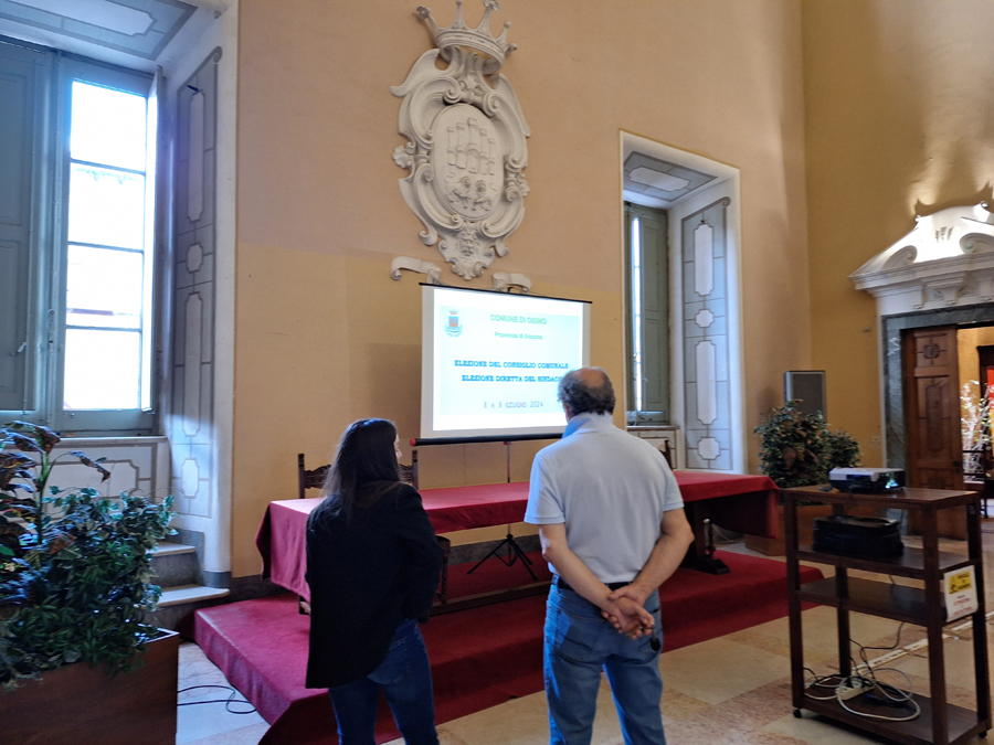 Il maxi schermo allestito nella Sala Maggiore del comune di Osimo il giorno dello spoglio delle schede al primo turno di voto