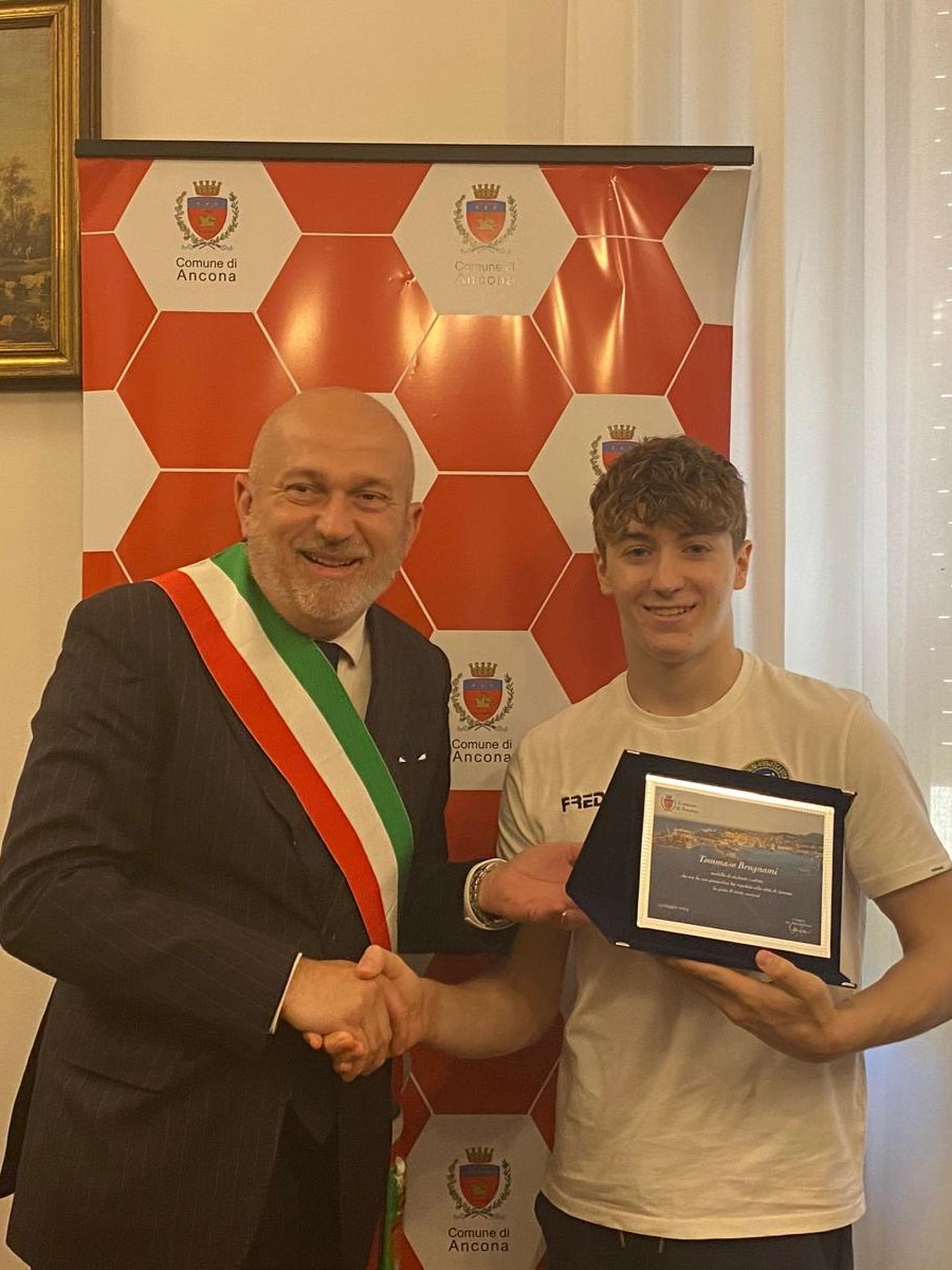 Il ginnasta Tommaso Brugnami premiato da due sindaci per i successi sportivi. Stamattina l’atleta 17enne campione di ginnastica con due ori individuali (corpo libero e volteggio) e un argento a squadre a Stoccolma, sbaragliando anche nella competizione europea a Rimini lo scorso aprile con tre argenti e due ori, è stato premiato nella Sala consiliare del Comune di Ancona dal vicesindaco, nonché assessore allo Sport, Giovanni Zinni e dall’assessore alle Politiche Giovanili Marco Battino.