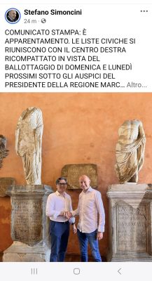 «Il centrodestra si compatta sotto l’insegna delle liste civiche di nuovo riunite in vista del ballottaggio ad Osimo.- annuncia il comunicato ufficiale – La compagine di Francesco Pirani, (otto Liste civiche da sempre più la lista di Fratelli d’Italia) ha trovato la via dell’apparentamento con sei delle sette liste di quella guidata Sandro Antonelli (Osimo futura, Progetto Osimo, Osimo al centro, Osimo libera, Rinasci Osimo, Tratto comune) e così dopo il primo turno, per il secondo le Liste civiche osimane hanno ritrovato la strada comune per andare uniti al ballottaggio contro il centrosinistra».