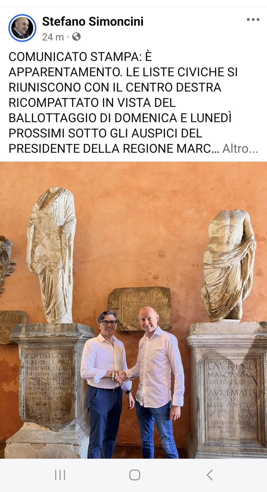 Pirani e Antonelli avevano affrontato il primo turno separati, il primo con il sostegno di Fratelli d’Italia, il secondo con quello di Forza Italia, Lega e Azione, anche senza simboli. Da quanto emerge, a Lista Civitas Civici di Giancarlo Mengoni (in quota Azione) che era parte della coalizione Antonelli, non ha aderito all’apparentamento. «Un risultato di grande importanza che riporta le Liste civiche ma anche il centrodestra nella medesima sfera di appartenenza per arrivare più forte al ballottaggio previsto tra una settimana. – mette in evidenza la nota – Con la presentazione alla segreteria del Comune nei termini previsti dalla legge della documentazione relativa all’apparentamento di ulteriori liste a quelle del candidato a sindaco, Francesco Pirani si presenta domenica 23 e lunedì 24 giugno con il vigore rinnovato di una coalizione che, una volta ricompattata, esprime la maggiore volontà del cambiamento» conclude il comunicato.