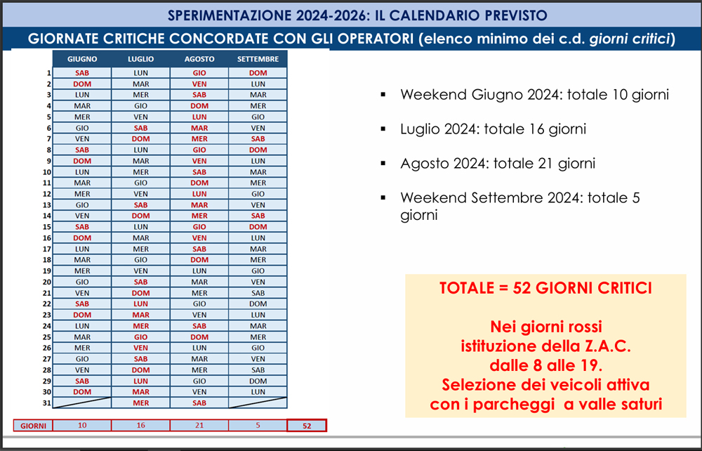 Si è concretizzata così l’idea di di istituire la Zac a Portonovo dal 2024 al 2026. Progetto condiviso con gli operatori della baia, per il quale, in occasione di specifici incontri ed è stato definito anche un calendario specifico. Per l’estate 2024 sono programmate 52 attivazioni della Zac nelle giornate ritenute più critiche, da giugno a settembre. Nel dettaglio, oltre ai 10 test di giugno, per tutto luglio saranno in totale 16 i giorni considerati a ‘bollino rosso’ per gli accessi dei veicoli di bagnanti, operatori balneari, lavoratori e fornitori che diventeranno 21 ad agosto e 5 a settembre. In queste circostanze di potenziale sovraffollamento la Zac scatterà dalle ore 8 alle 19 con la selezione dei veicoli attiva se i parcheggi a valle diventeranno saturi.