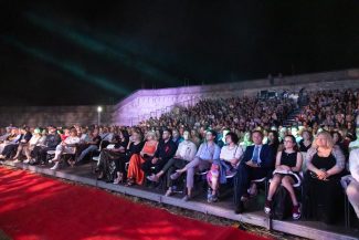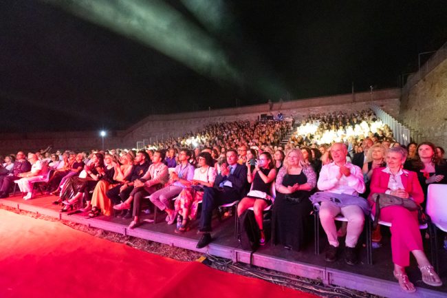 Una leggera pioggia caduta proprio quando il tramonto avrebbe dovuto colorare di luce l’inaugurazione dello spettacolo dedicato al solstizio d’estate non ha rovinato l’evento né scalfito la determinazione e la pervicacia con la quale i 780 spettatori del nuovo show estivo di Popsophia hanno aperto l’ombrello in attesa dell’inizio. Una serata evento, da grande occasione, ha salutato la riapertura dell’Anfiteatro romano di Ancona riallestito in tempo record come location per gli appuntamenti estivi organizzati dal comune. Ricchissimo il parterre degli invitati fra autorità civili e militari, oltre al sindaco Daniele Silvetti, all’assessore regionale alla cultura Chiara Biondi, gran parte della giunta del comune anconetano, consiglieri comunali, esponenti dell’ufficio scolastico regionale, operatori culturali, che hanno partecipato ad un momento storico per la storia della città. E la solennità dell’appuntamento è stata evidente al momento dei saluti.