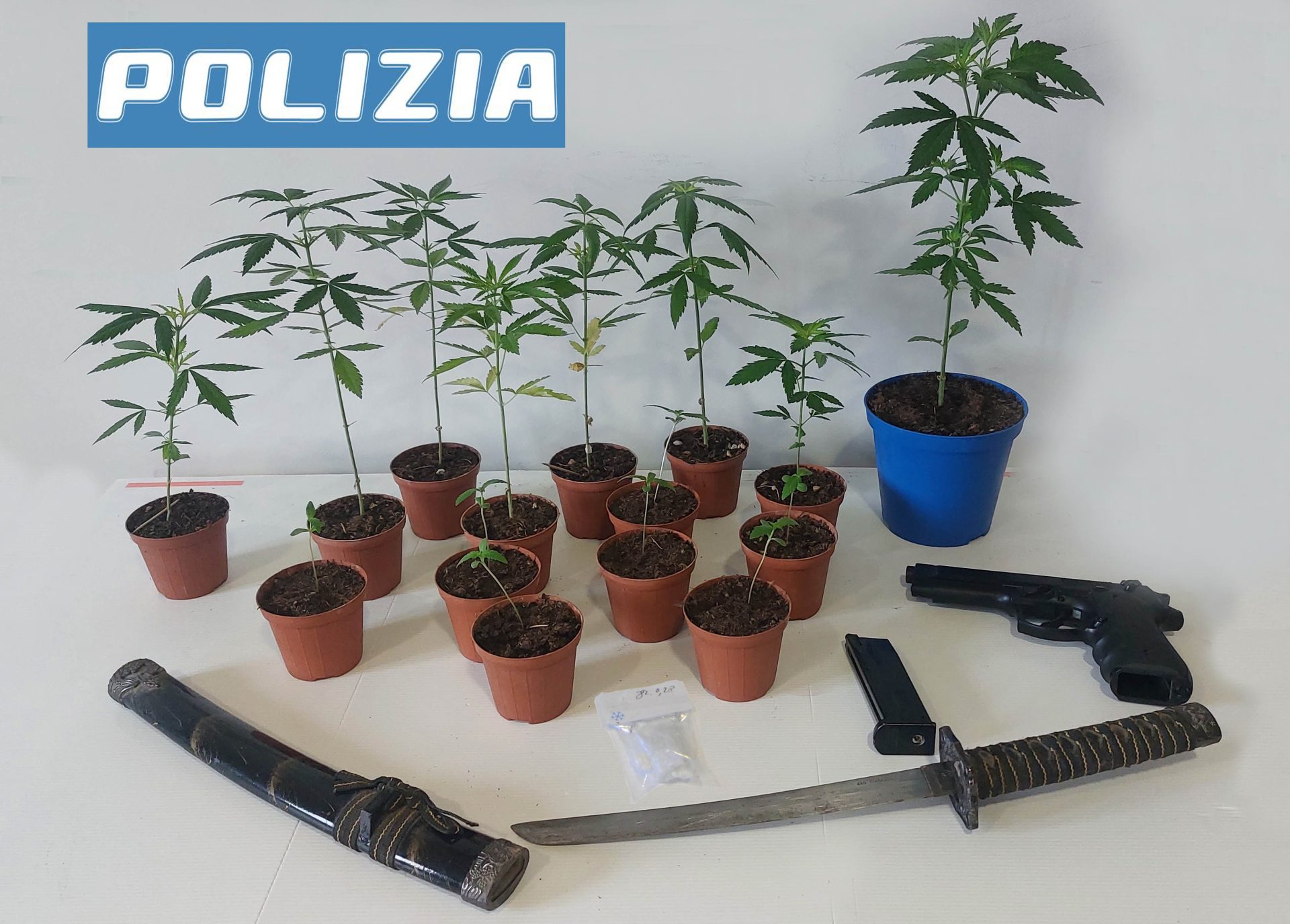 I poliziotti, dopo aver raccolto le prime informazioni, hanno effettuato di iniziativa una perquisizione dell’abitazione del 44enne trovando una pistola a gas con caricatore, col tappo rosso verniciato, esatta replica di una pistola 92 sb parabellum; una sciabola del tipo “Katana” con fodera e lama appuntita ed affilata della lunghezza di 28 centimetri, e 15 piante di cannabis coltivate dall’uomo in appositi vasi con terriccio oltre a un involucro di cellophane contenente cocaina e del peso di 0,28 grammi. Il tutto è stato sequestrato L’uomo è stato quindi denunciato per minacce e coltivazione di stupefacenti. Il tutto è stato inoltre comunicato al questore che ha notificato anche la misura dell’ammonimento.