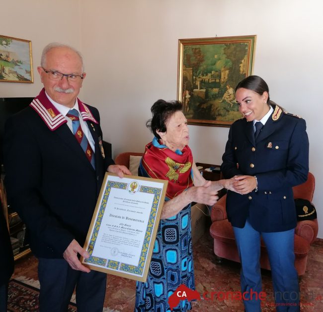 Questa mattina il Commissario Capo Daniela Iscaro, in rappresentanza del Questore di Ancona, Cesare Capocasa, unitamente al Presidente della Sezione dorica dell’A.N.P.S., Giovanni Aguzzi, le hanno fatto visita per consegnarle un importantissimo riconoscimento pervenuto dal Presidente Nazionale dell’Associazione della Polizia di Stato, Michele Paternoster motivato dalla “lunga ed ininterrotta militanza e l’alto senso di appartenenza al sodalizio, per il prezioso contributo e il meritorio impegno sempre generosamente offerti all’attività della Sezione di Ancona, volti alla crescita ed allo sviluppo dell’Associazione nel territorio”.