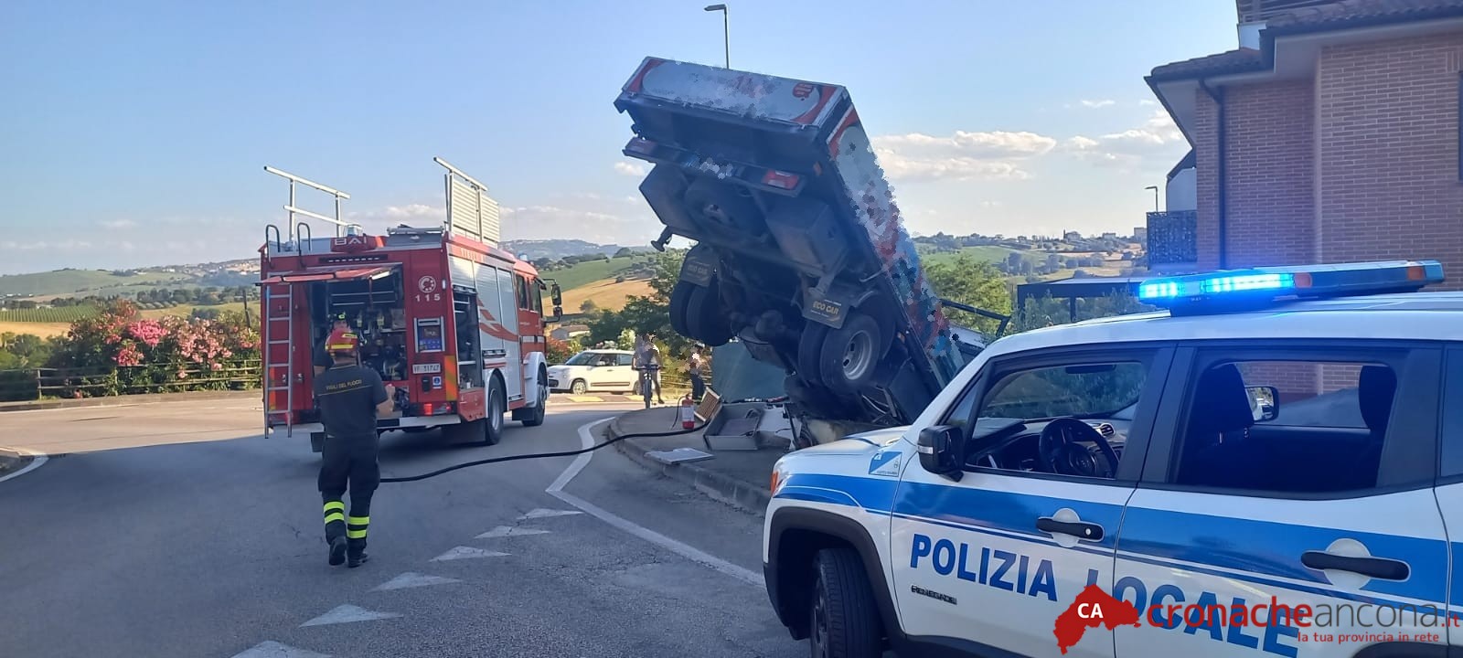 E’ avvenuto intorno alle 19 quando un autocarro, per cause in corso di accertamento da parte della polizia locale, intervenuta sul posto insieme ai vigili del fuoco di Osimo, è uscito di strada all’altezza della rotatoria via Brandoni – via Nobel, località Crocette.