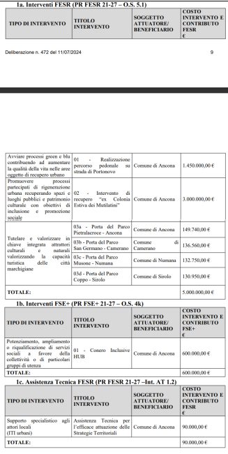 Tra gli interventi finanziati con fondi Fse+ 21-27 sono previsti invece il potenziamento, ampliamento o riqualificazione di servizi sociali a favore della collettività o di particolari gruppi di utenza ‘Conero inclusive’ per 600.000 euro con progetti dedicati a minori, disabili ed anziani come colonie estive e sport camp, escursioni organizzate della baia e percorsi di musicoterapia e ginnastica. Finanziata infine con 90.000 euro l’assistenza tecnica Fesr e il supporto specialistico agli attori locali per l’efficace attuazione delle Strategie Territoriali.