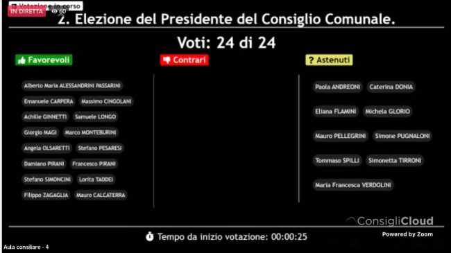 Hanno preso parte al voto solo 14 consiglieri più il sindaco Francesco Pirani (assente Dino Latini) nelle file di maggioranza Liste civiche-FdI e tutti i 9 d’opposizione di centrosinistra che si sono astenuti. Il parlamentino cittadino è stato presieduto oggi dalla consigliera anziana (quella che ha ottenuto più preferenze) Paola Andreoni (Pd). Il primo round per l’elezione di Simoncini è andato a vuoto con 15 sì e 9 astensioni, idem il secondo interpuntato anche dalla sospensione della seduta chiesta dal sindaco Pirani nel tentativo di condividere e convincere la minoranza a sostenere il nome designato in aula dal consigliere di maggioranza Emanuela Carpera (Su la testa). Michela Glorio (Lista Glorio) dai banchi d’opposizione aveva parlato di momento importante per la democrazia sottolineando che era però mancata proprio la condivisione con le minoranze. «Siamo stati esclusi dall’opportunità di contribuire all’elezione fattiva del presidente, nulla di personale verso Stefano ma ci sentiamo nel metodo di non essere rappresentati. Pertanto ci asterremo come segnale di apertura verso la maggioranza» aveva eccepito.