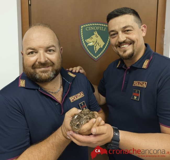 Mentre si trovavano nei pressi dell’aeroporto di Falconara per svolgere un’esercitazione di ricerca con il cane antidroga Imperator, occupati nell’attività di addestramento, si sono accorti che l’attenzione del poliziotto a quattro zampe veniva attirata da un rumore proveniente dalla vegetazione situata a pochi metri di distanza. Così, i due agenti si sono avvicinati notando la figura di un animale allontanarsi velocemente e, nella stessa direzione, nascosto nella vegetazione e immobile, un cucciolo di lepre individuato come preda da quello poi fuggito.