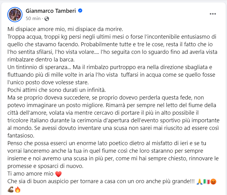 «Se proprio doveva succedere, se proprio dovevo perderla questa fede, non potevo immaginare un posto migliore. – scrive ancora il campione anconetano di salto in alto – Rimarrà per sempre nel letto del fiume della città dell’amore, volata via mentre cercavo di portare il più in alto possibile il tricolore italiano durante la cerimonia d’apertura dell’evento sportivo più importante al mondo. Se avessi dovuto inventare una scusa non sarei mai riuscito ad essere così fantasioso. Penso che possa esserci un enorme lato poetico dietro al misfatto di ieri e se tu vorrai lanceremo anche la tua in quel fiume così che loro staranno per sempre insieme e noi avremo una scusa in più, come mi hai sempre chiesto, per rinnovare le promesse e sposarci di nuovo. Ti amo amore mio, che sia di buon auspicio per tornare a casa con un oro anche più grande!»