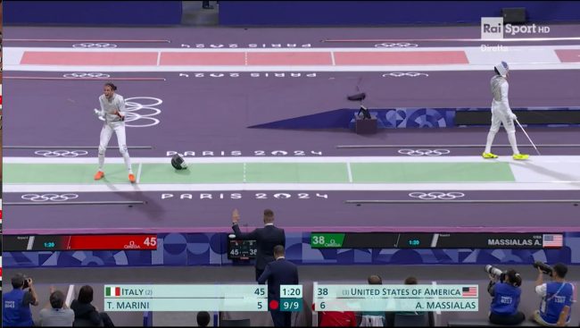 Alle 14.50 nuova performance della squadra allenata dal ct azzurro Stefano Cerioni che ha vinto per 45-38 sugli Stati Uniti. Gli italiani, ormai sul podio, sono sempre più vicini conquista della medaglia d’oro. Al termine di una combattuta semifinale si è commosso Marini, campione mondiale 2023 ed europeo 2024 , che, dopo l’esclusione agli ottavi nelle prove individuali, oggi ha ritrovato la sua verve ed eleganza in pedana, tra stoccate e cambi di fioretto.
