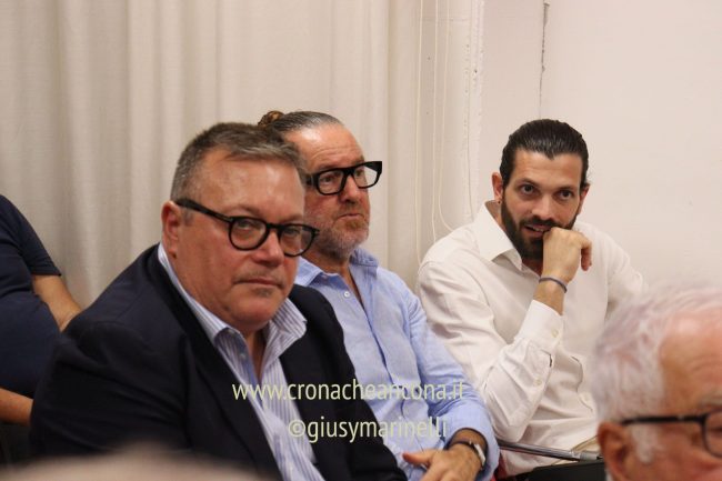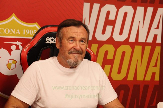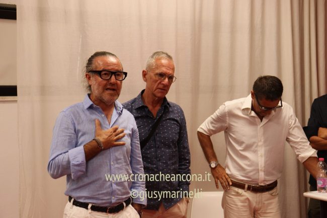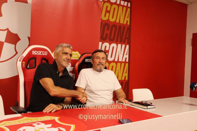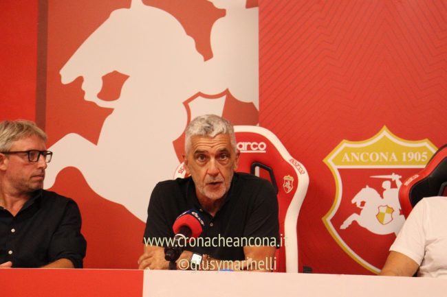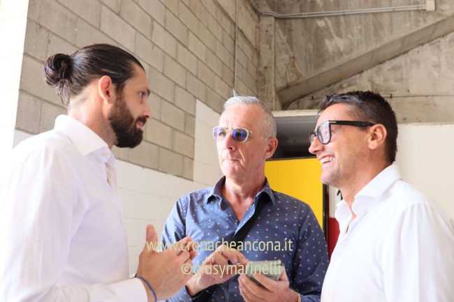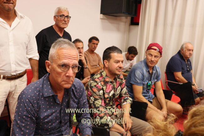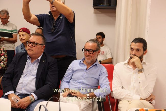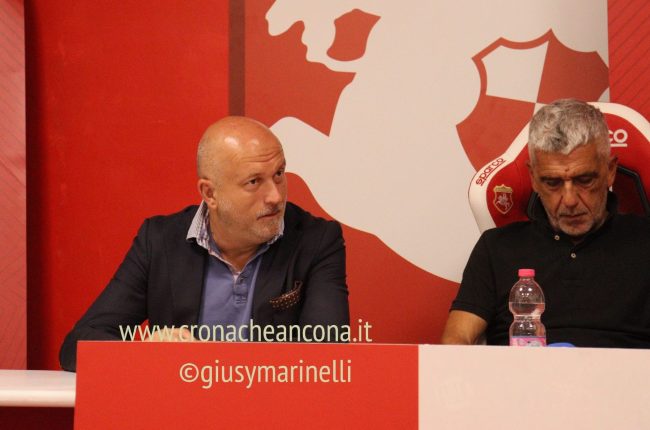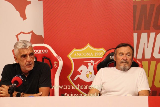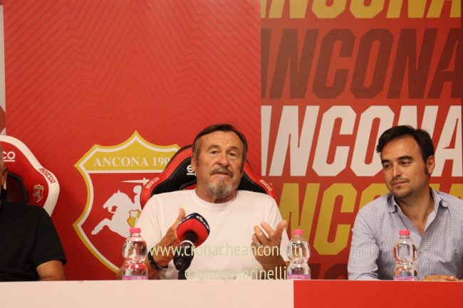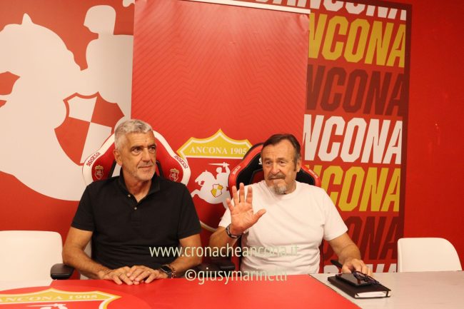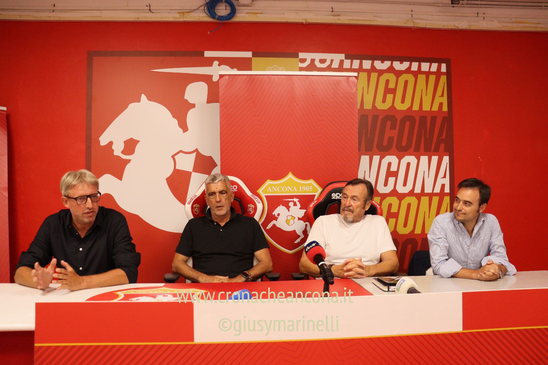 Nella sala stampa “Sergio Roscani” hanno parlato l’allenatore Massimo Gadda e il presidente onorario nonché responsabile dell’area tecnica Vincenzo Guerini, seduti insieme agli assessori Angelo Eliantonio e Giovanni Zinni; in piedi i soci di maggioranza della SSC Ancona Stefano Marconi e Massimiliano Polci.