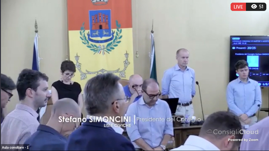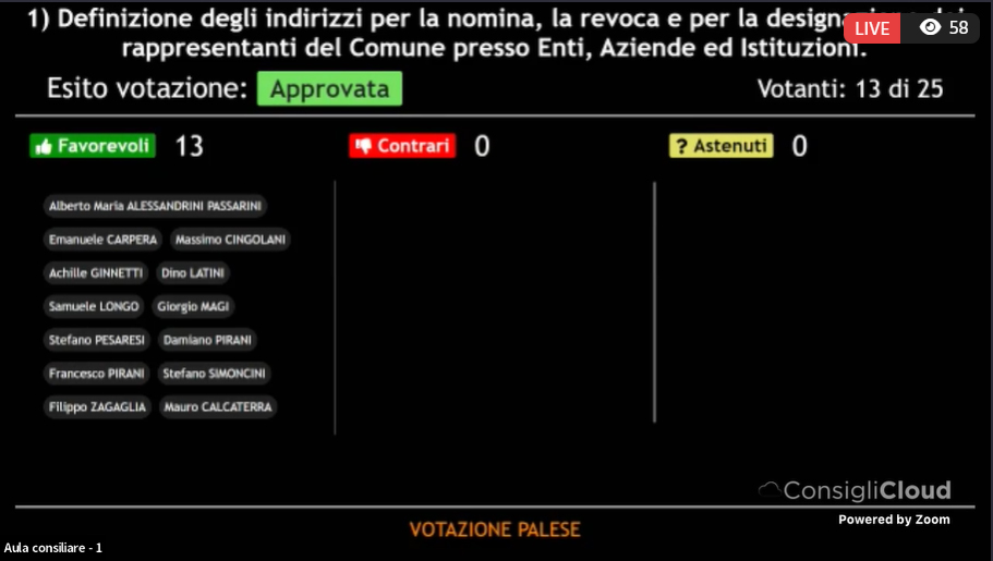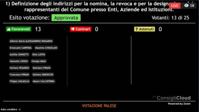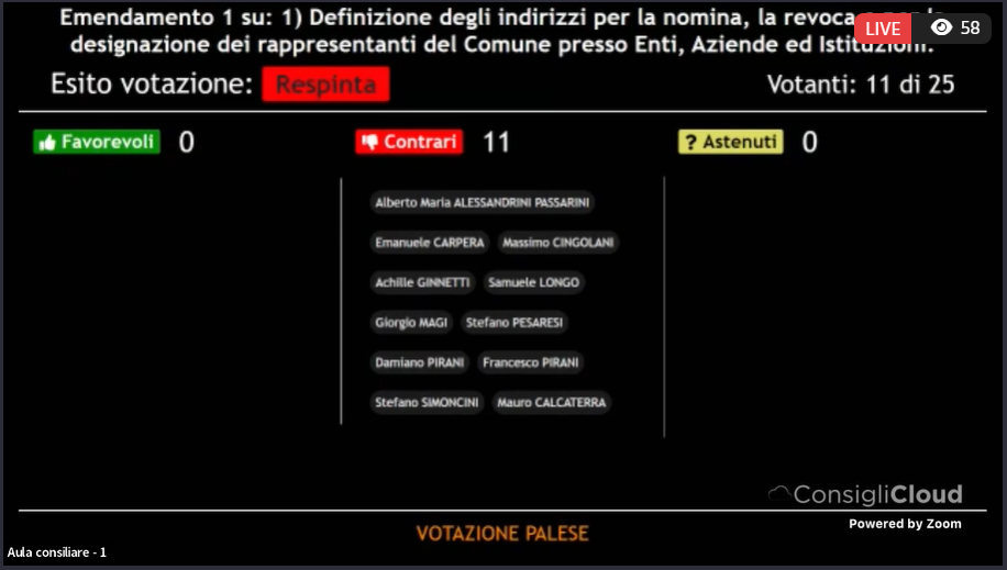Il presidente del Consiglio, Stefano Simoncini, interpretando il regolamento, poco dopo le 20 ha sospeso la seduta per dieci minuti prima di fare l’appello, mentre tutti i consiglieri di minoranza abbandonavano l’emiciclo per protesta. Qualcuno di loro veniva anche diffidato dal presidente e minacciato di inserire censure a verbale in caso di registrazione di video come prova per testimoniare la presenza dei banchi di maggioranza vuoti. Nel frattempo venivano richiamati in aula o invitati a collegarsi da remoto alcuni consiglieri della coalizione di governo. Quando il segretario supplente, Barbara Vallasciani, che oggi sostituiva il titolare Alessio Maria D’Angelo, ha rifatto l’appello al termine dei 10 minuti, sono risultati presenti 14 consiglieri su 16 di maggioranza, sindaco compreso (Dino Latini è poi tornato in aula). Un numero adeguato per mantenere aperta la seduta e avere il quorum necessario a bocciare l’emendamento della minoranza e per approvare la delibera così come era stata pensata in origine dalla maggioranza, con nomine scelte a chiamata e a discrezione di sindaco e Consiglio comunale. L’opposizione non ha partecipato alla votazione.