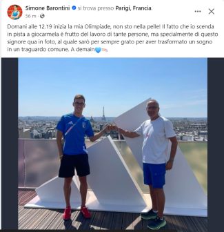 «Domani alle 12.19 inizia la mia Olimpiade, non sto nella pelle! Il fatto che io scenda in pista a giocarmela è frutto del lavoro di tante persone, ma specialmente di questo signore qua in foto, al quale sarò per sempre grato per aver trasformato un sogno in un traguardo comune. A demain». Parola di Simone Barontini. Il mezzofondista di Ancona si è scattato una foto con il suo coach Fabrizio Dubbini a Parigi con vista Tour Eiffel e l’ha pubblicata sui Social a poche ore dal suo esordio olimpico. Domani sarà allo start delle batterie per la gara di qualificazione per la semifinale degli 800 metri che lo vedrà impegnato in maglia azzurra per l’Italia insieme a Catalin Tecuceanu. Dopo il ritiro tra S.Moritz e Predazzo, il campione anconetano di 25 anni ha affrontato gli ultimi allenamenti all’Italico Conti prima della partenza, domenica scorsa, per il villaggio olimpico francese.