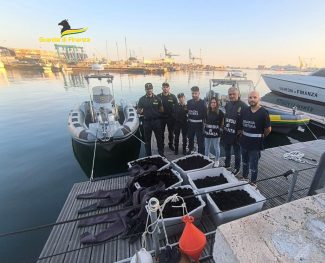 Impegnati nell’attività di pattugliamento in mare con una motovedetta, i finanzieri del Roan hanno avvistato un piccolo natante sospetto, che stava navigando a luci spente, con 3 persone a bordo in tuta subacquea, intenti a pescare nelle acque antistanti la diga foranea della Fincantieri.