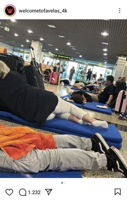 L’immagine dei passeggeri accampati nell’aeroporto di Madeira rilanciata su Instagram da ‘Welcolme to Favelas’