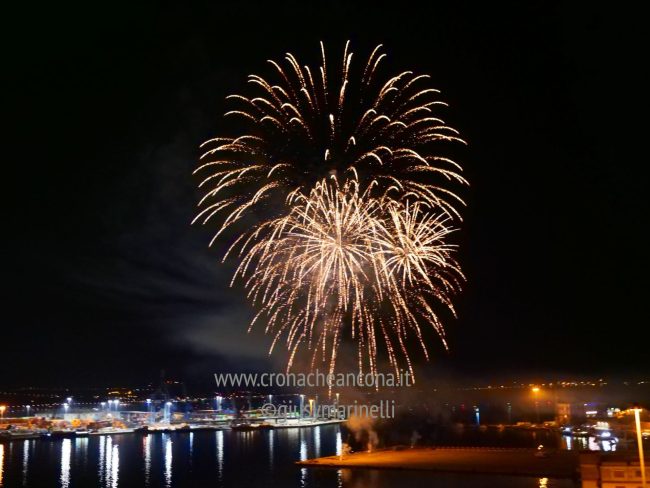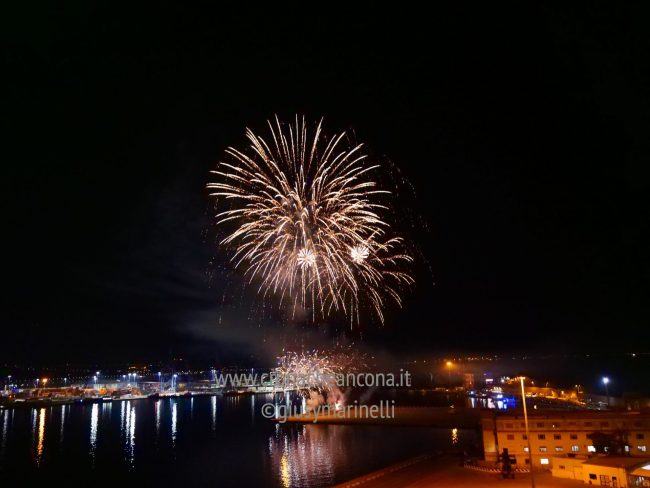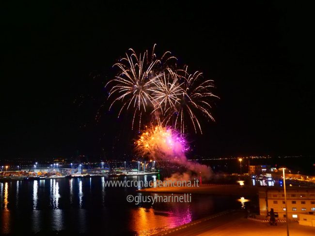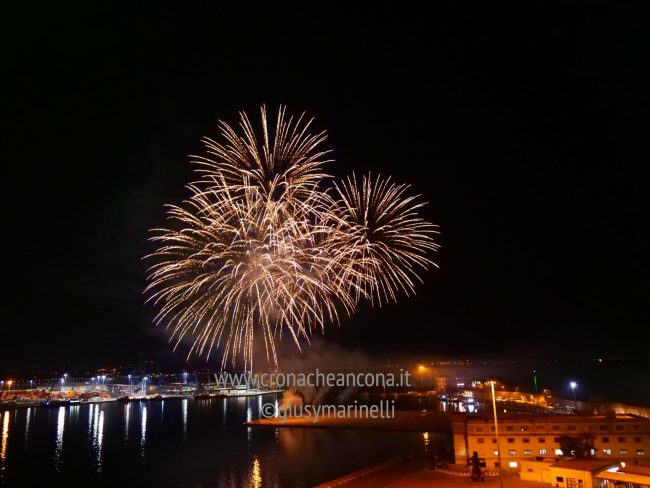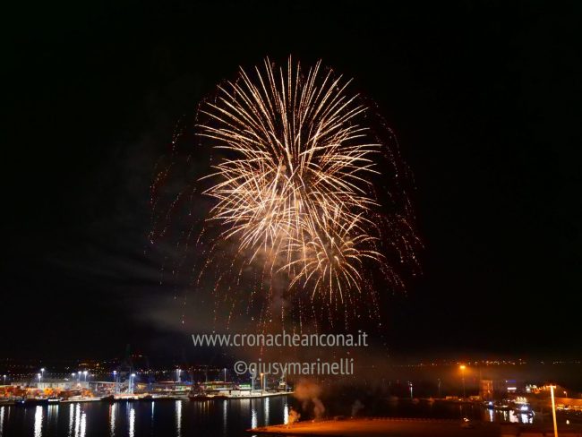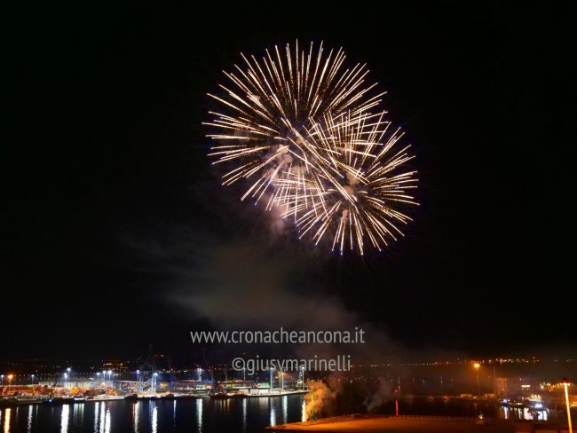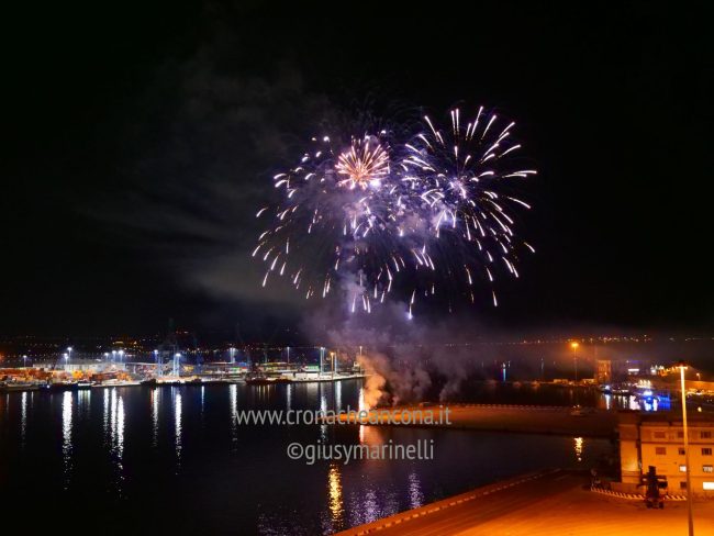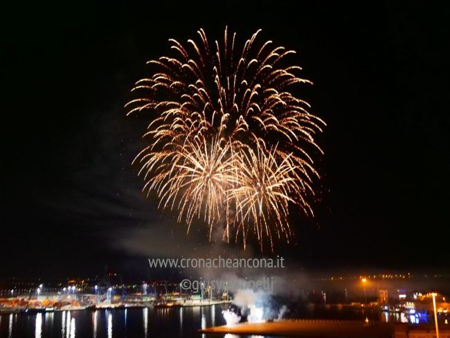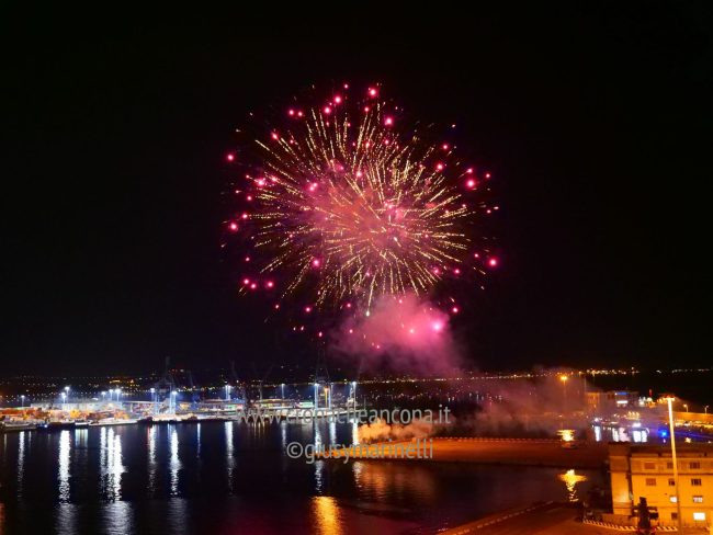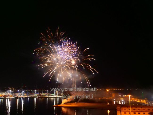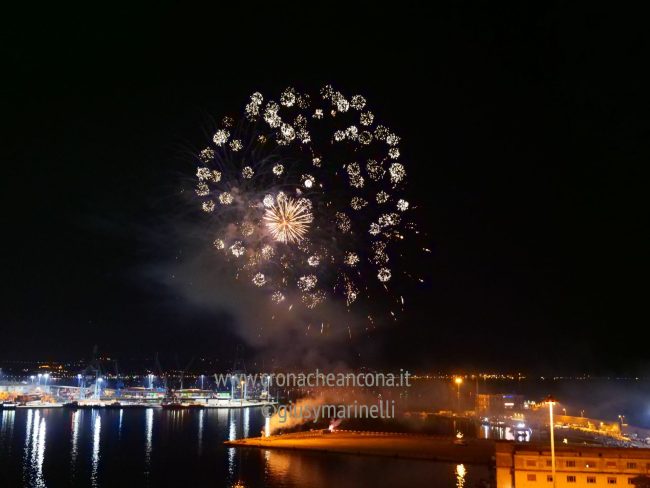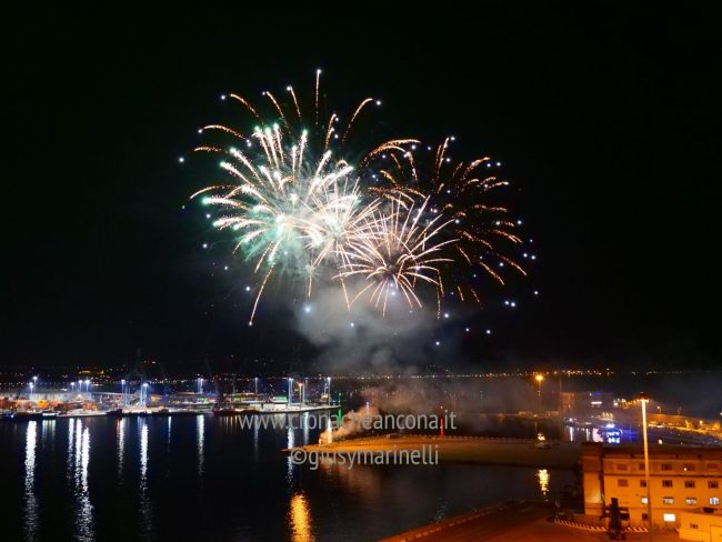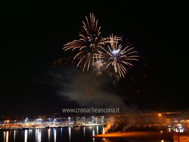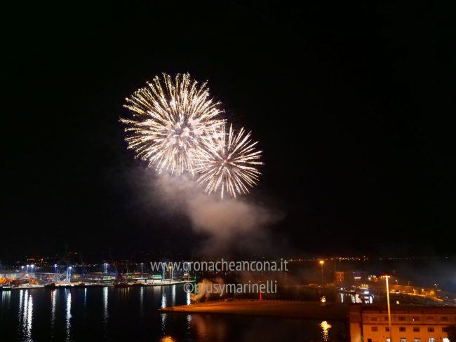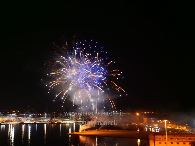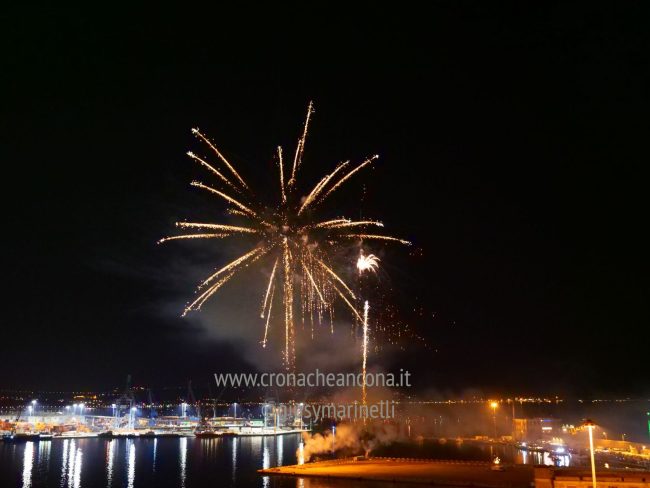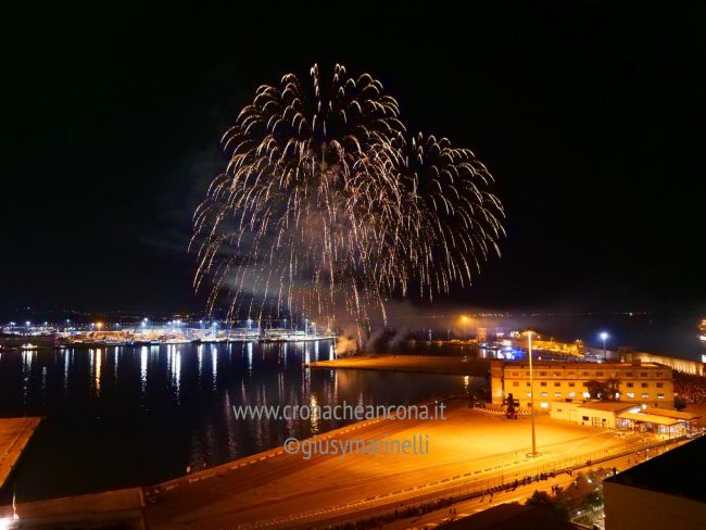 Allestiti della ditta Fonti Pirotecnica Srl di Riccione, i fuochi di artificio hanno iniziato ad illuminare il cielo della città alle 22,30. Per la realizzazione di questo spettacolo sono stati utilizzati circa 12 mila effetti diversi, tra cui alcune figure che costituiscono delle novità in campo pirotecnico, esclusive per Ancona. La gestione è avvenuta con una centralina informatizzata che ha coordinato, attraverso diverse postazioni informatiche, 1.200 detonatori a terra per far partire lo spettacolo in sincrono, per un crescendo di giochi luminosi e quadri monocromatici a 150 metri di altezza.